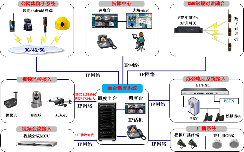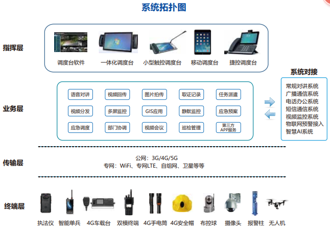 - 傳輸層:系統(tǒng)支持各類(lèi)通信傳輸網(wǎng)絡(luò)的接入融合,能夠?qū)崿F(xiàn)和衛(wèi)星通信、3G/4G/5G/1.4G、GSM/CDMA、有線(xiàn)IP網(wǎng)絡(luò)、PSTN、WIFI等各類(lèi)有線(xiàn)/無(wú)線(xiàn)通信網(wǎng)絡(luò)的融合接入。