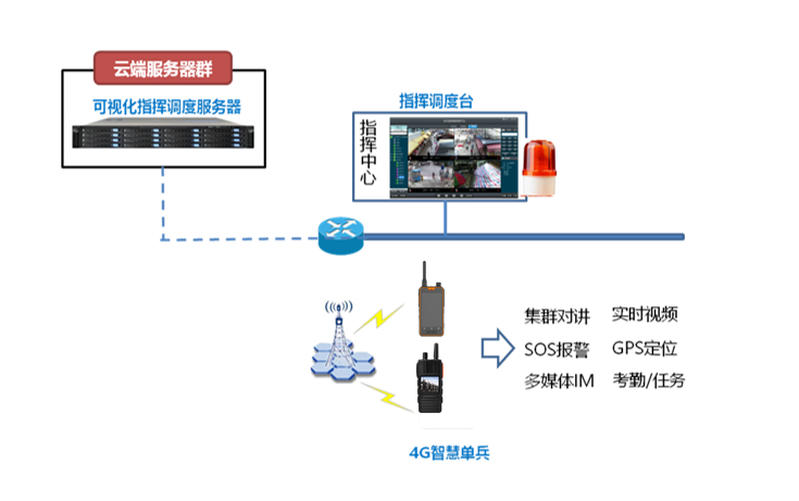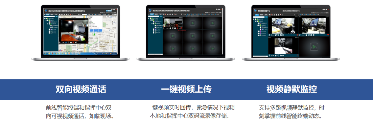 - 終端層:系統(tǒng)支持各類(lèi)音頻、視頻、數(shù)據(jù)終端的融合接入,包括執(zhí)法儀、智能單兵、4G車(chē)載臺(tái)、雙模終端、4G手電筒、4G安全帽、布控球、攝像頭、報(bào)警柱、無(wú)人機(jī)、衛(wèi)星電話(huà)等各類(lèi)終端的融合接入,通過(guò)展現(xiàn)層各操作終端,可直接對(duì)接入終端進(jìn)行統(tǒng)一調(diào)度。