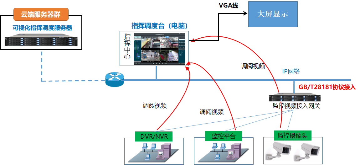 包括DVR/NVR接入、監(jiān)控平臺(tái)接入、監(jiān)控?cái)z像頭接入,其中如果監(jiān)控?cái)z像頭是模擬攝像頭,則需要增加支持GB/T28181協(xié)議的網(wǎng)絡(luò)編碼器。