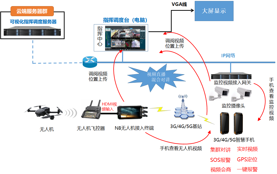 融合通信系統(tǒng)可以接入無(wú)人機(jī)視頻,通過(guò)支持HDMI安卓系統(tǒng)的智能終端接入無(wú)人機(jī)視頻,實(shí)現(xiàn)無(wú)人機(jī)飛控器定位,以及指揮調(diào)度臺(tái)與無(wú)人機(jī)飛控器操作員的雙向語(yǔ)音通信。