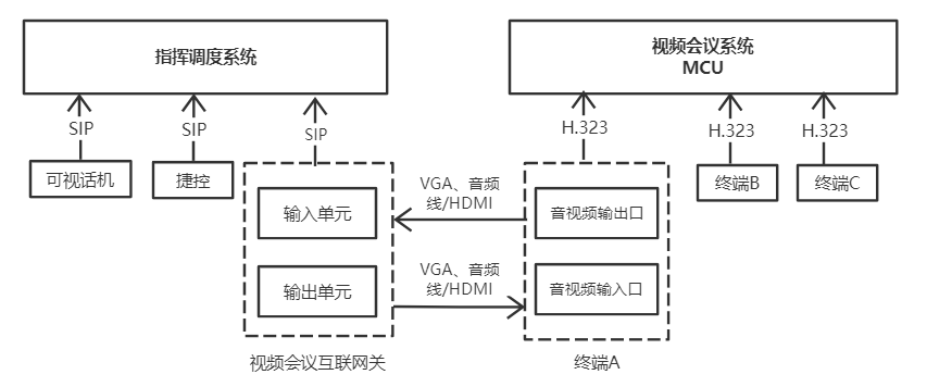 MCU發(fā)起視頻會(huì)議,將終端A加入會(huì)場(chǎng);指揮調(diào)度系統(tǒng)發(fā)起會(huì)議,將視頻會(huì)議互聯(lián)網(wǎng)關(guān)加入會(huì)場(chǎng),實(shí)現(xiàn)雙方會(huì)場(chǎng)互通。此時(shí)在MCU的會(huì)場(chǎng)中,看到的終端A的音視頻畫(huà)面是來(lái)自視頻會(huì)議互聯(lián)網(wǎng)關(guān)(視頻會(huì)議互聯(lián)網(wǎng)關(guān)的音視頻流由指揮調(diào)度系統(tǒng)控制);在指揮調(diào)度系統(tǒng)的會(huì)場(chǎng)中,看到的視頻會(huì)議互聯(lián)網(wǎng)關(guān)的音視頻畫(huà)面是來(lái)自終端A(終端A的音視頻流由MCU推給終端A)。